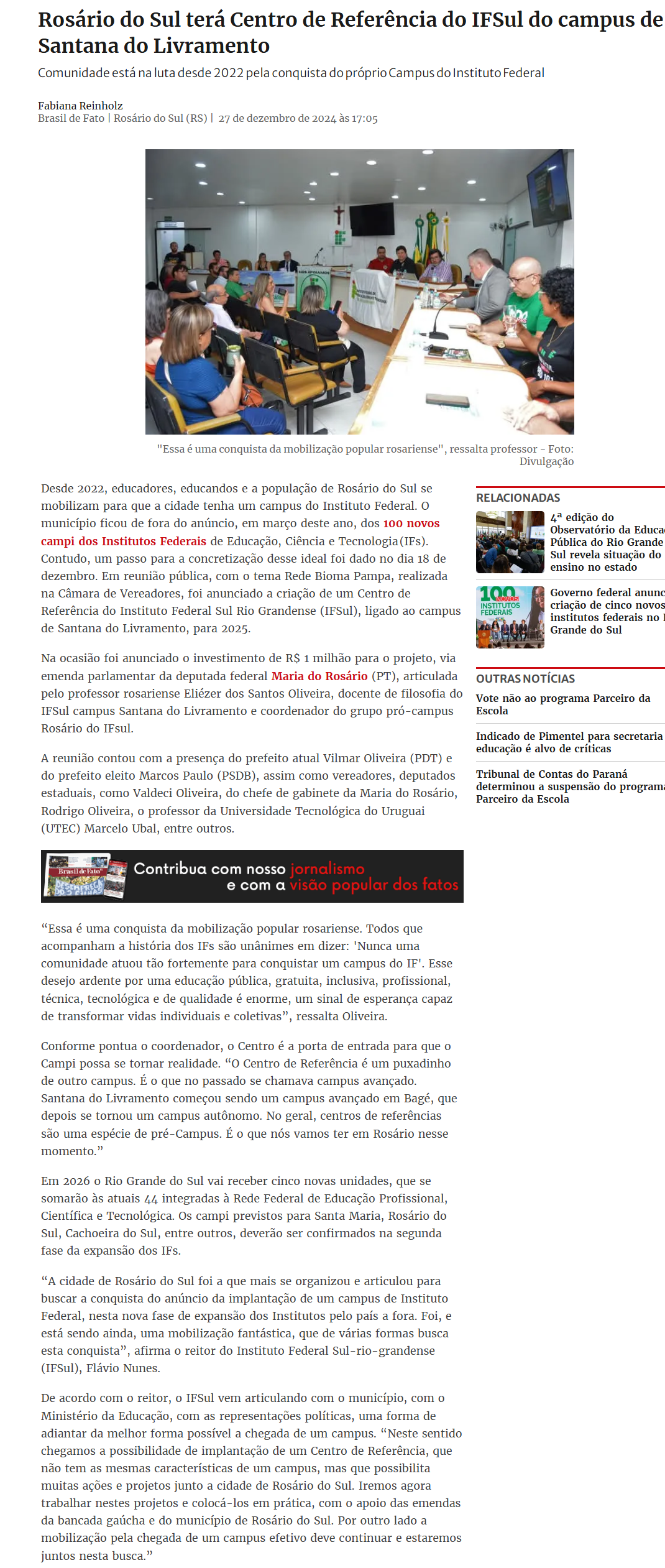 Brasil de Fato - Rosário do Sul terá Centro de Referência do IFSul do campus de Santana do Livramento