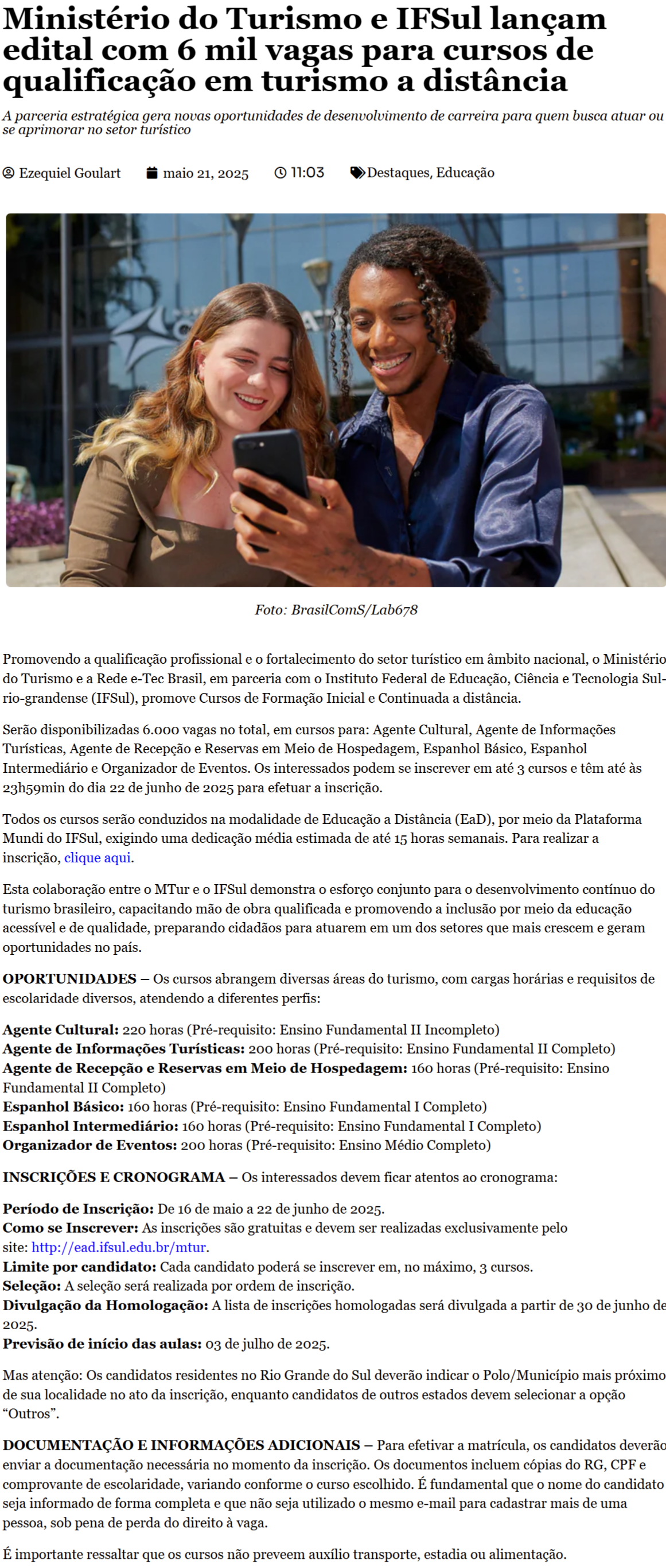 Planalto News - Ministério do Turismo e IFSul lançam edital com 6 mil vagas para cursos de qualificação em turismo a distância