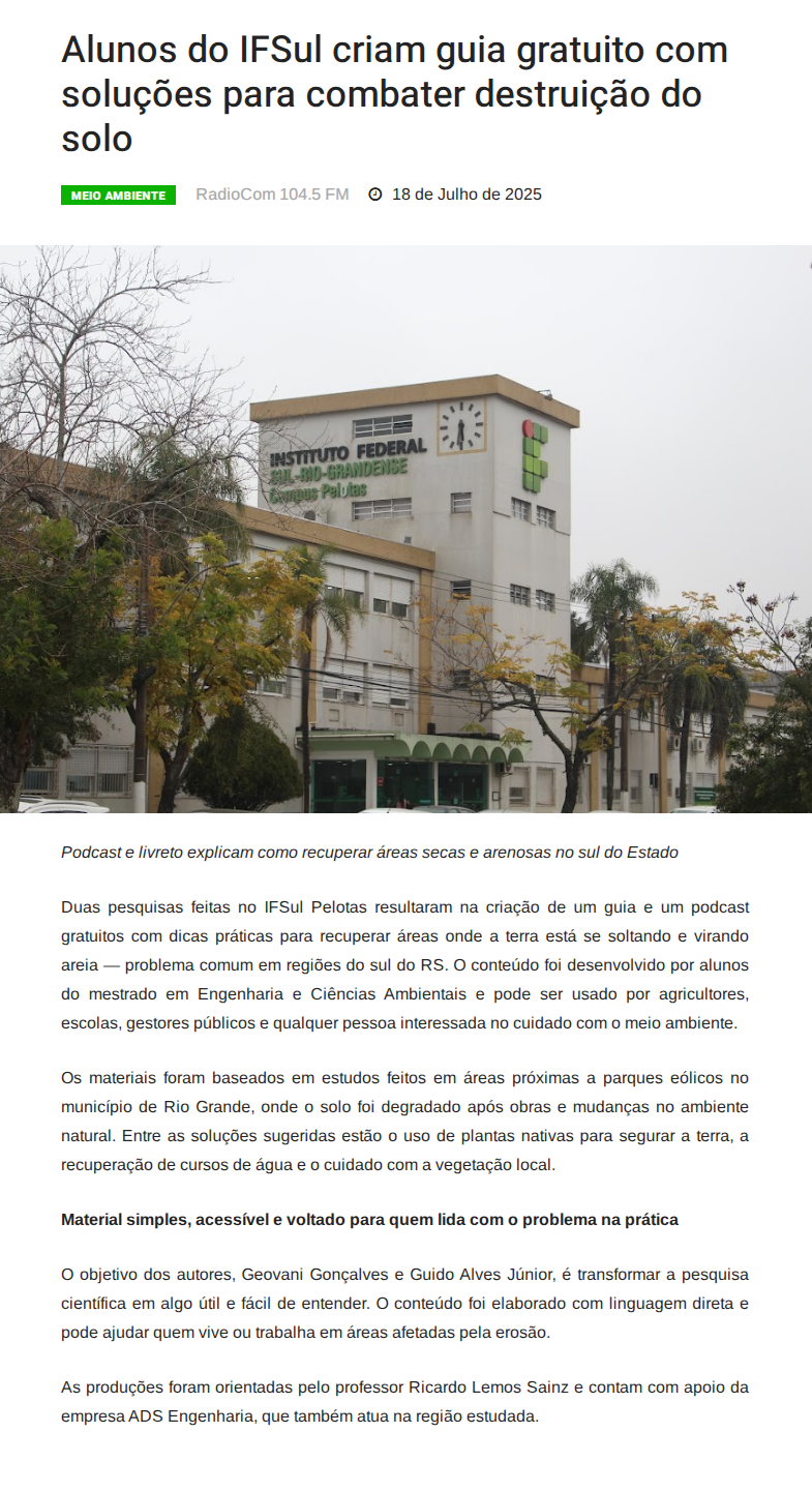 Rádio Com - Alunos do IFSul criam guia gratuito com soluções para combater destruição do solo
