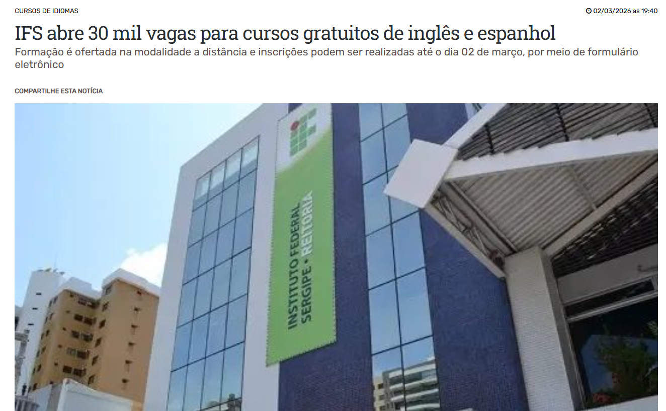 Jornal da Cidade - IFS abre 30 mil vagas para cursos gratuitos de inglês e espanhol