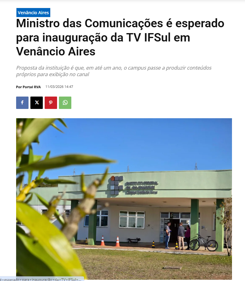 Portal RVA - Ministro das Comunicações é esperado para inauguração da TV IFSul em Venâncio Aires