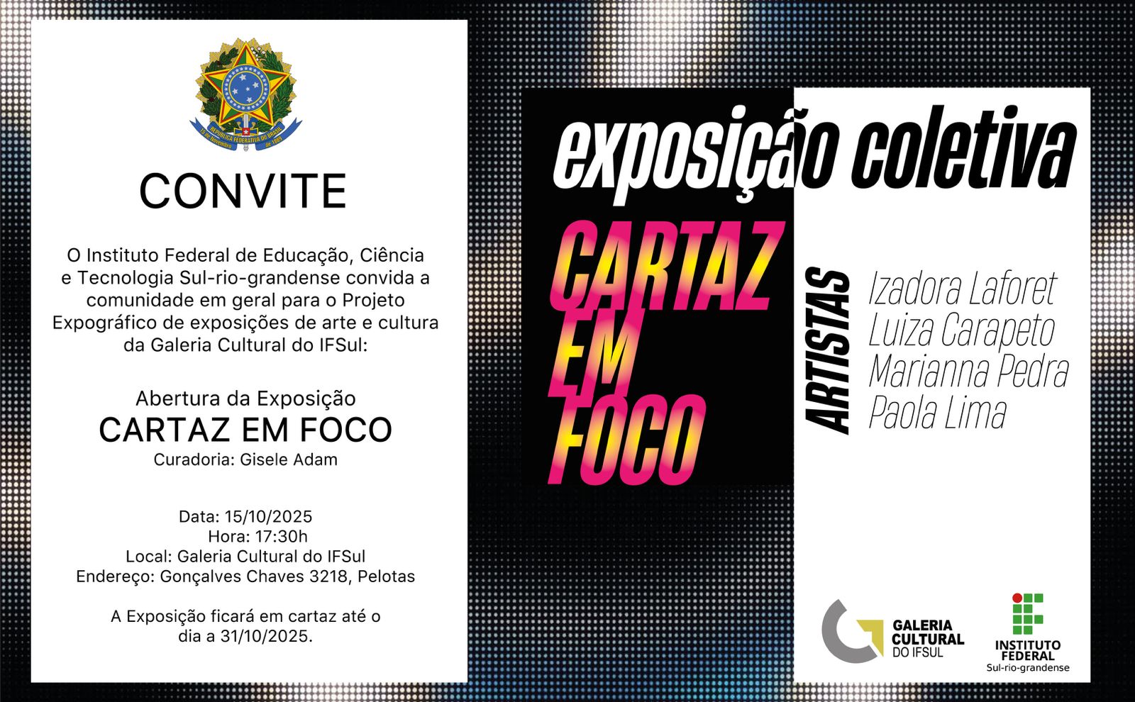 Aberta ao público entre os dias 15 e 31 de outubro, a exposição “Cartaz em Foco” convida a comunidade a explorar novas formas de compreender o cartaz como expressão artística. A mostra integra o Projeto Expográfico de exposições de arte e cultura da Galeria Cultural do IFSul.