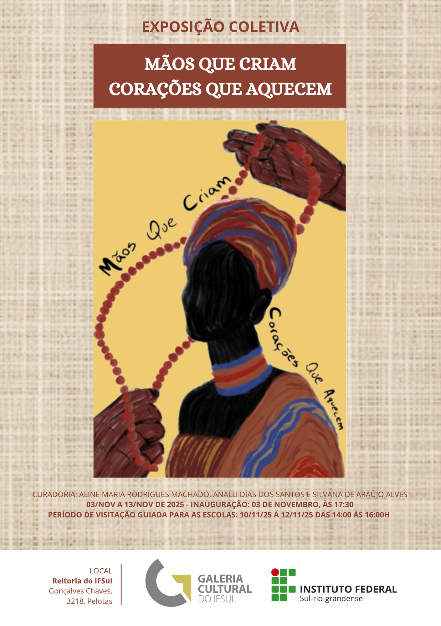 Com o propósito de valorizar saberes tradicionais e fortalecer ações antirracistas, a exposição “Mãos que criam e corações que aquecem” apresenta os resultados do Projeto de Oficinas de Economia Solidária e Artesanatos Afro-Brasileiros, aprovado no Edital 007/2024 das Redes Antirracistas do Ministério da Igualdade Racial (MIR), em parceria com os Institutos Federais. A abertura ocorre no dia 3 de novembro, às 17h30, na Galeria de Exposições da Reitoria do IFSul, em Pelotas.