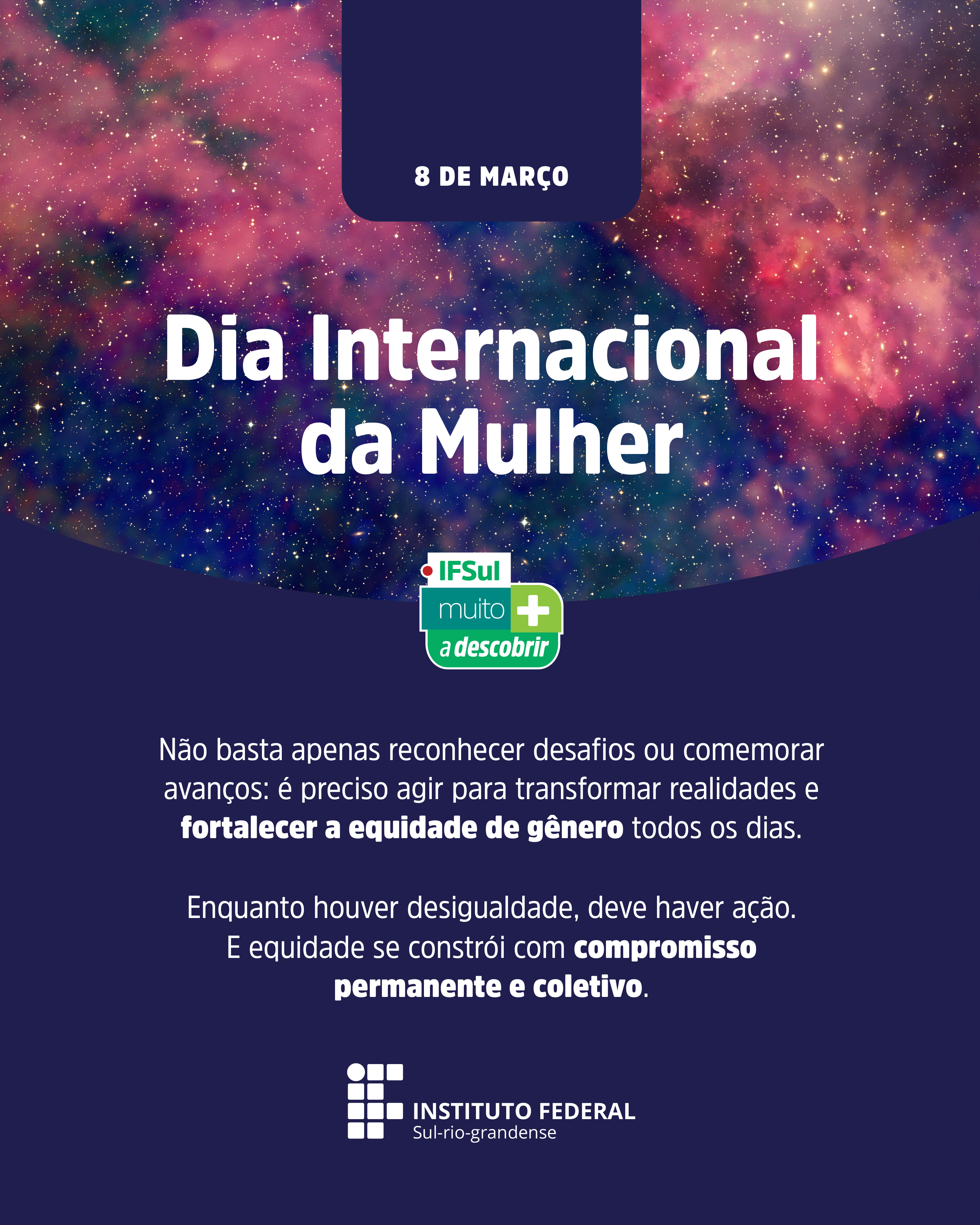 Texto institucional da Reitoria do IFSul destaca a importância do debate, da participação da comunidade e das ações voltadas à equidade, prevenção da violência e valorização das mulheres