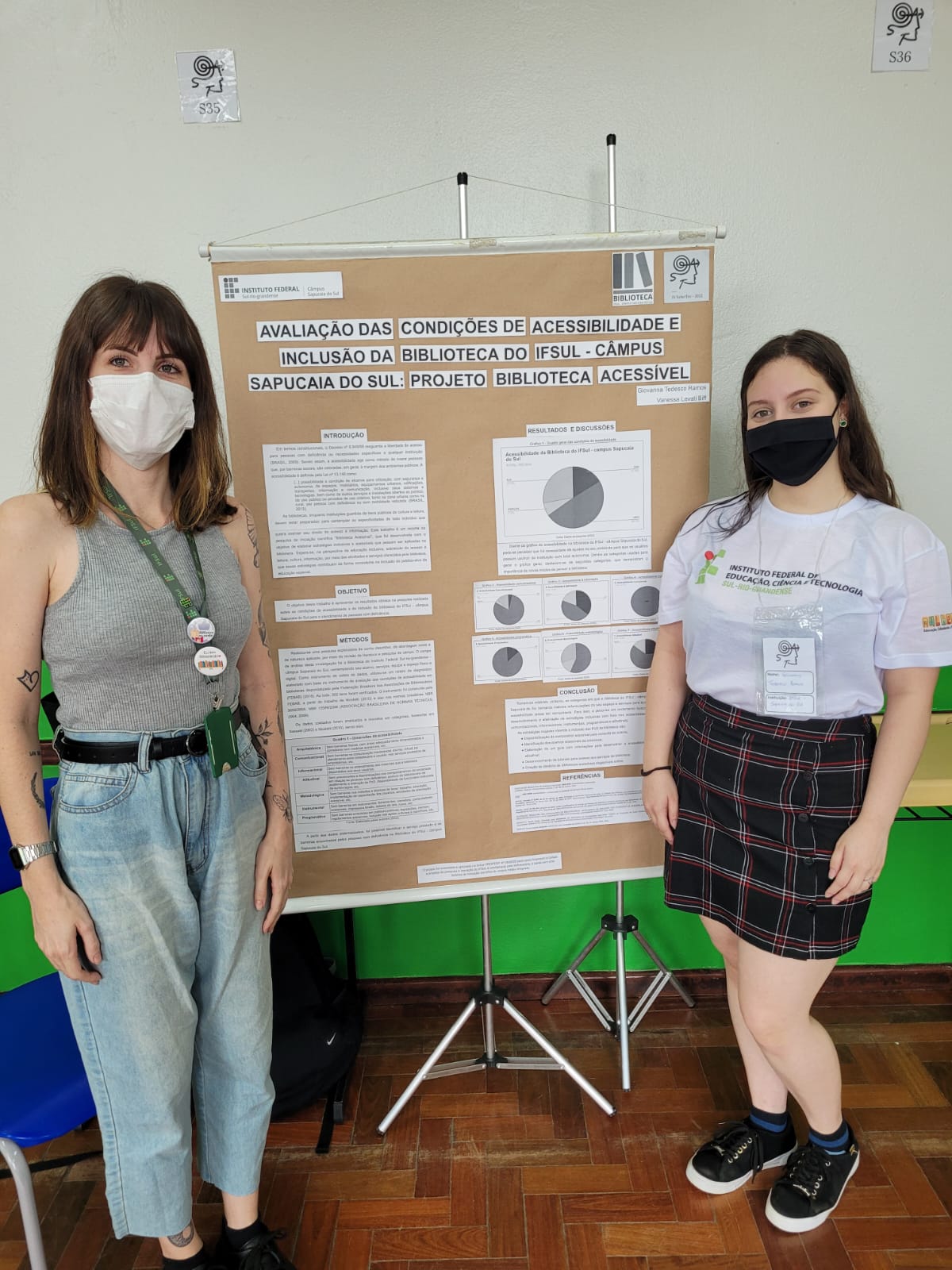 A bolsista de pesquisa Giovanna Tedesco Ramos, aluna do curso técnico de eventos integrado ao ensino médio, participou da IV SaberTec, no dia 7/12/2022, apresentando o trabalho intitulado "Avaliação das condições de acessibilidade e inclusão da Biblioteca do IFSul - Câmpus Sapucaia do Sul: projeto Biblioteca Acessível".
