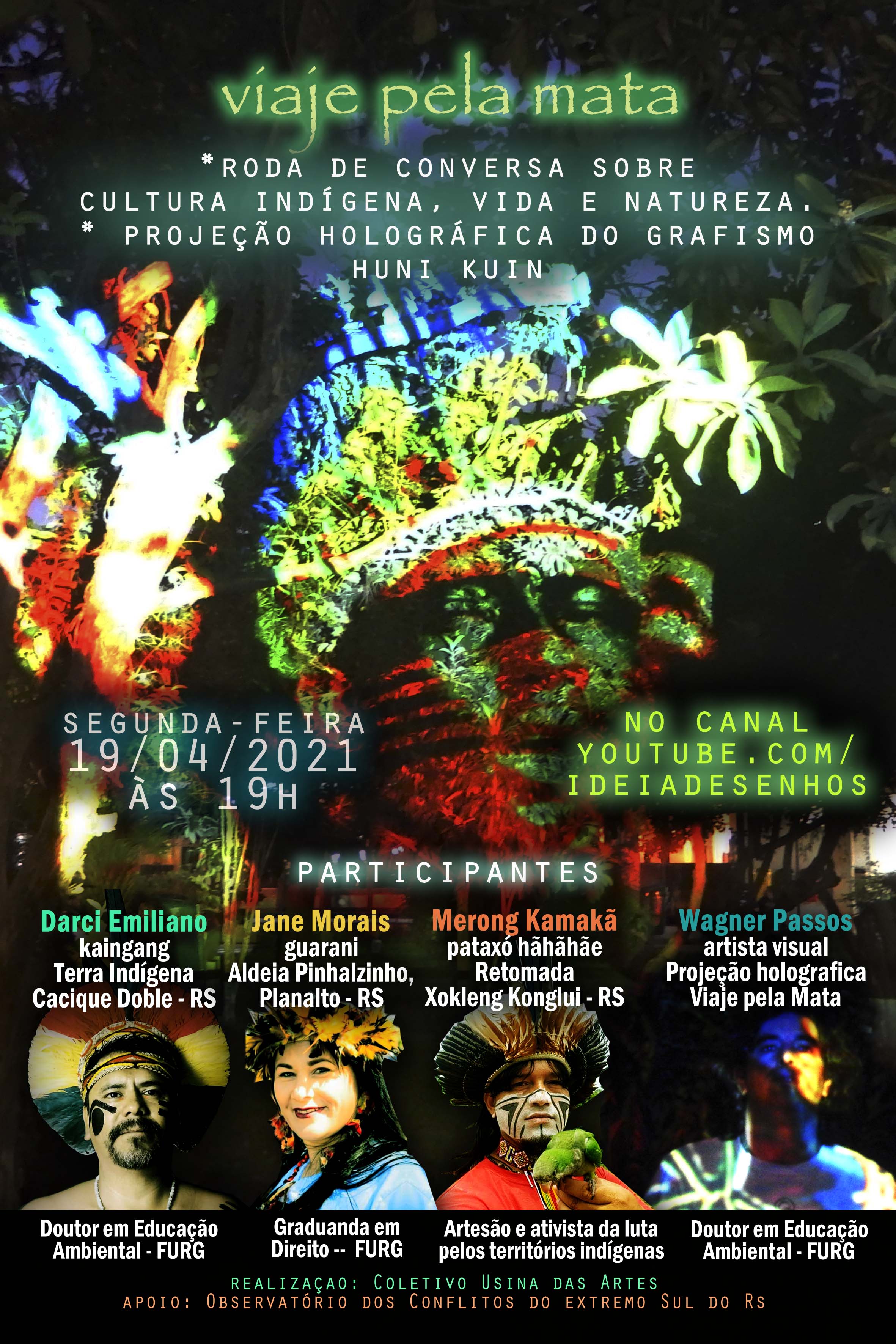 Além da projeção, também está marcado um bate-papo sobre a cultura indígena, a vida, a natureza e a luta dos povos na retomada de seus territórios. Os convidados para a conversa são Darci Emiliano, kaingang da Terra Indígena Cacique Doble e doutor em educação ambiental pela FURG; Jane Morais, guarani da Aldeia Pinhalzinho, Planalto (RS), ativista da luta indígena e graduanda em direito pela FURG; e Merong Kamakã, pataxó hãhãhãe, artesão e ativista da luta pelos territórios indígenas na retomada da terra Xokleng Konglui, em São Francisco de Paula (RS).