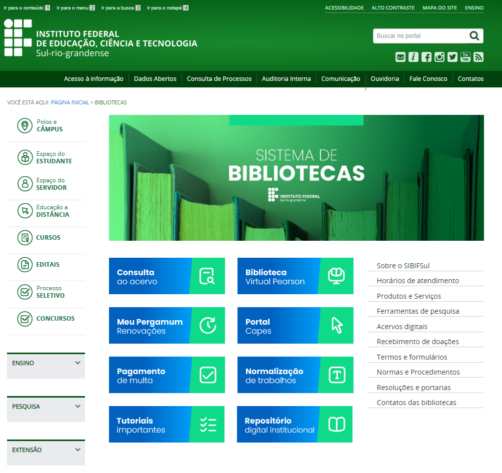O novo espaço pode ser acessado clicando no botão “Biblioteca”, a partir da página inicial do site do IFSul e também a partir do Espaço do Estudante.
