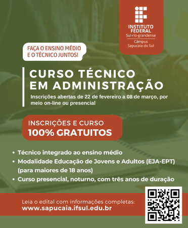 Estão abertas as inscrições para o processo seletivo do curso técnico em Administração, na modalidade Educação de Jovens Adultos na Educação Profissional e Tecnológica (EJA-EPT) do câmpus Sapucaia do Sul. O curso é totalmente gratuito, e as aulas ocorrem no turno da noite, presencialmente. As inscrições podem ser realizadas de forma online ou presencial, até o dia 08 de março.