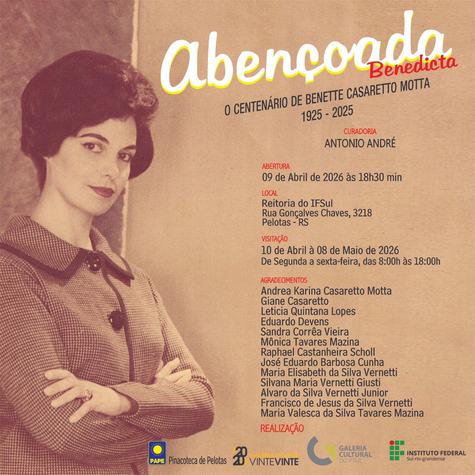 A Galeria Cultural da Reitoria do Instituto Federal Sul-rio-grandense (IFSul) recebe, a partir do dia 9 de abril de 2026, a exposição “Abençoada Benedicta: O centenário de Benette Casaretto Motta”. A abertura oficial ocorre às 18h30min, e a visitação estará aberta ao público até o dia 8 de maio.